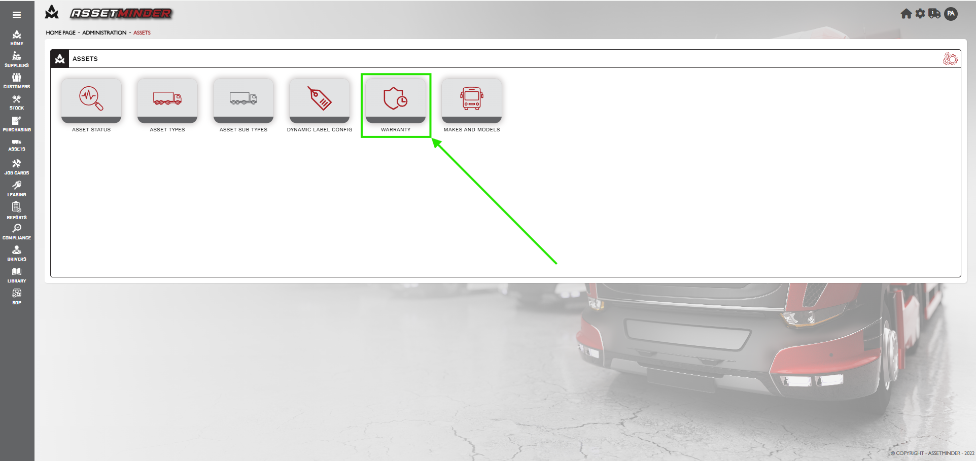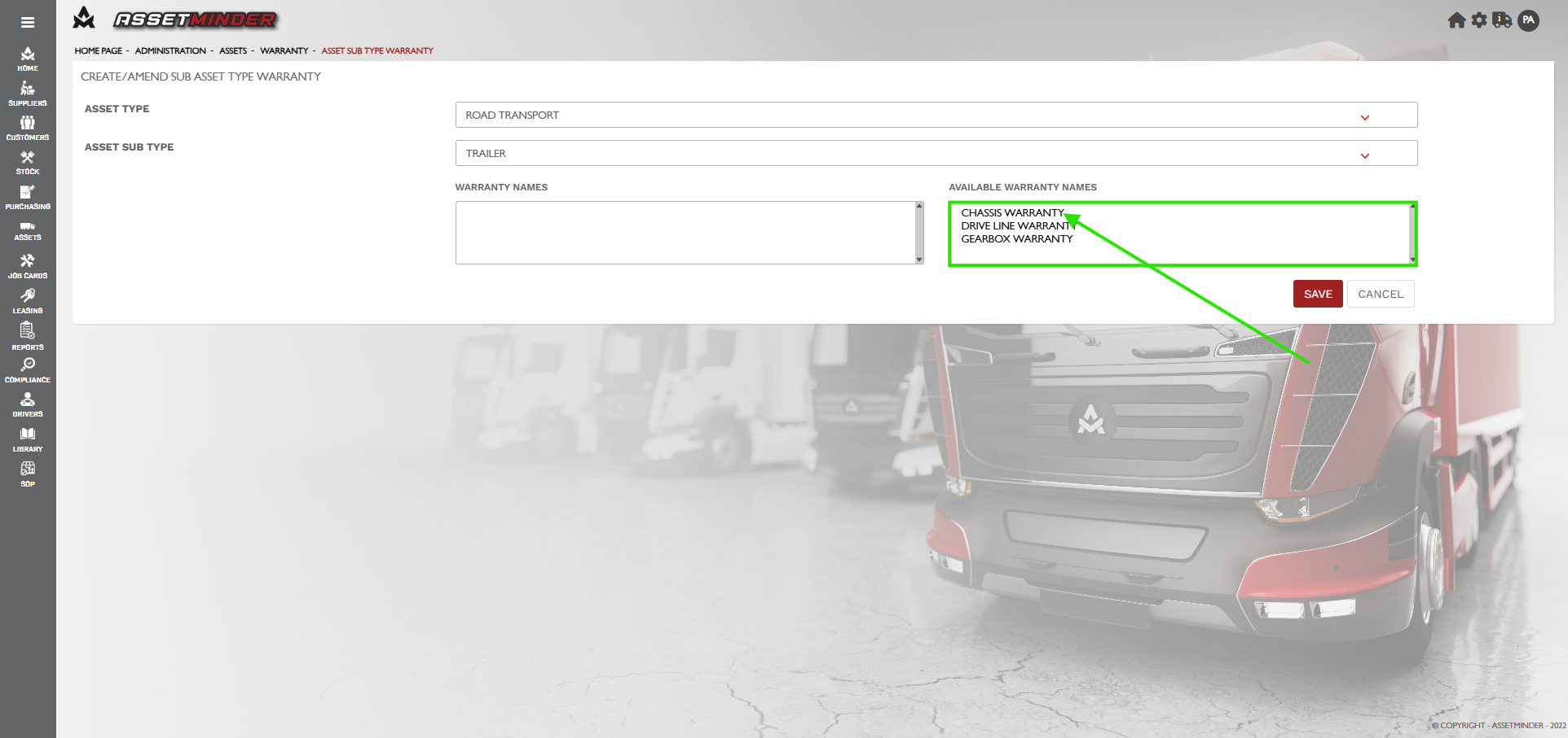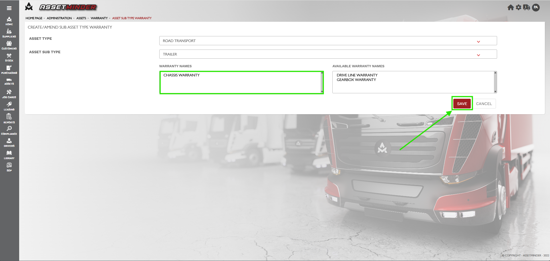 Click on the CREATE/AMEND SUB ASSET TYPE WARRANTY button.