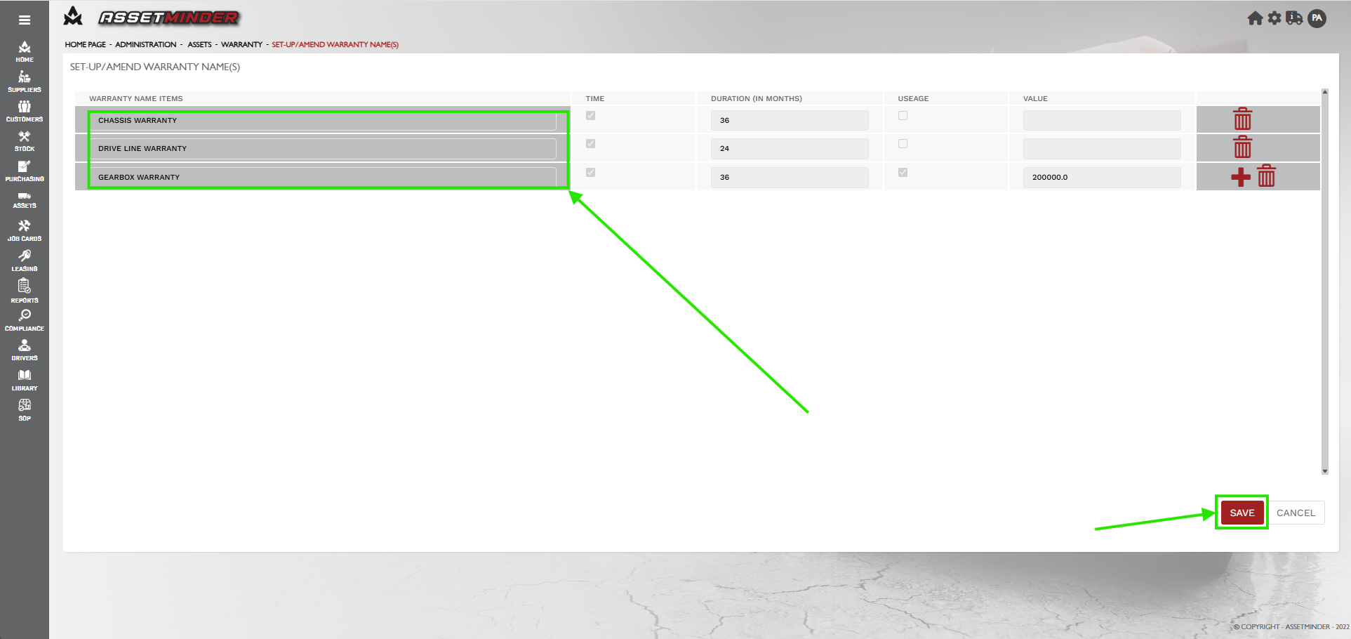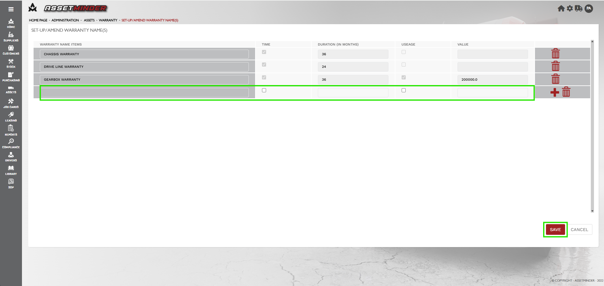 To amend the name of an existing warranty, simply type the details into the WARRANTY NAME field. Note that it is not possible to change any other detail.