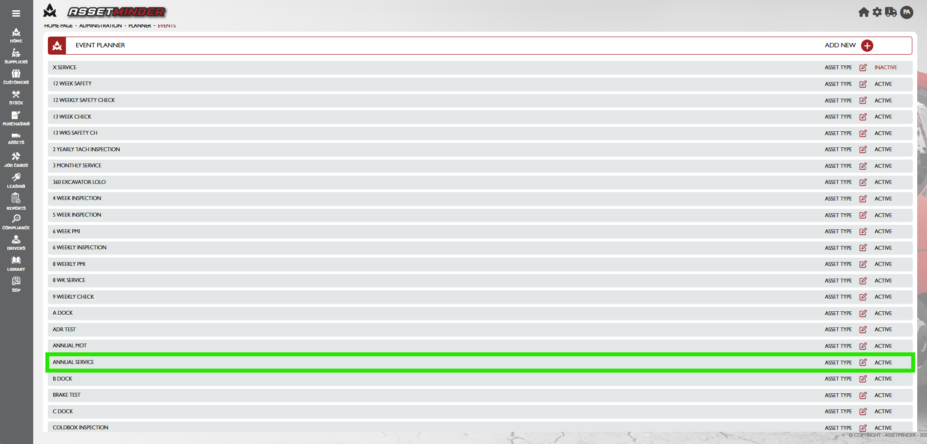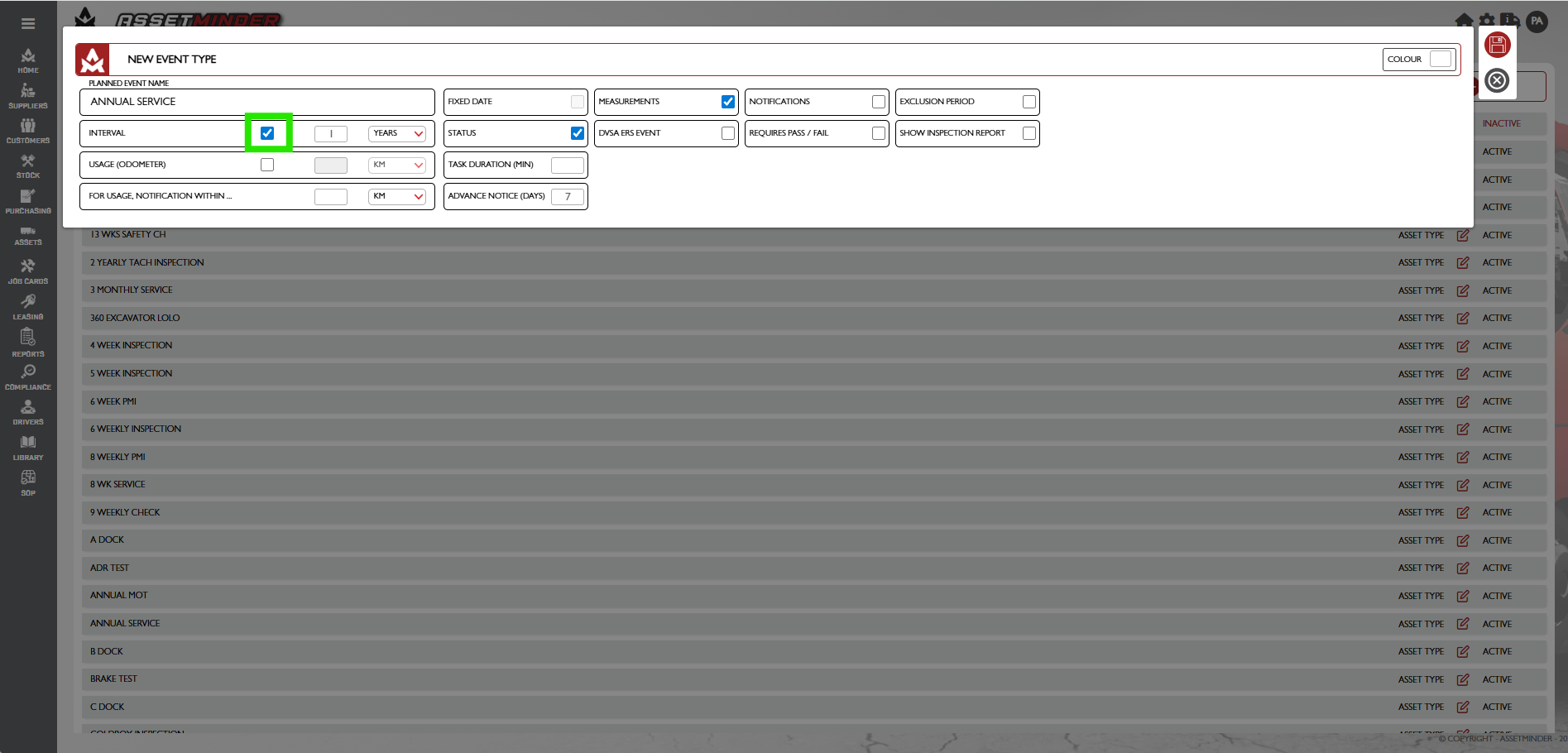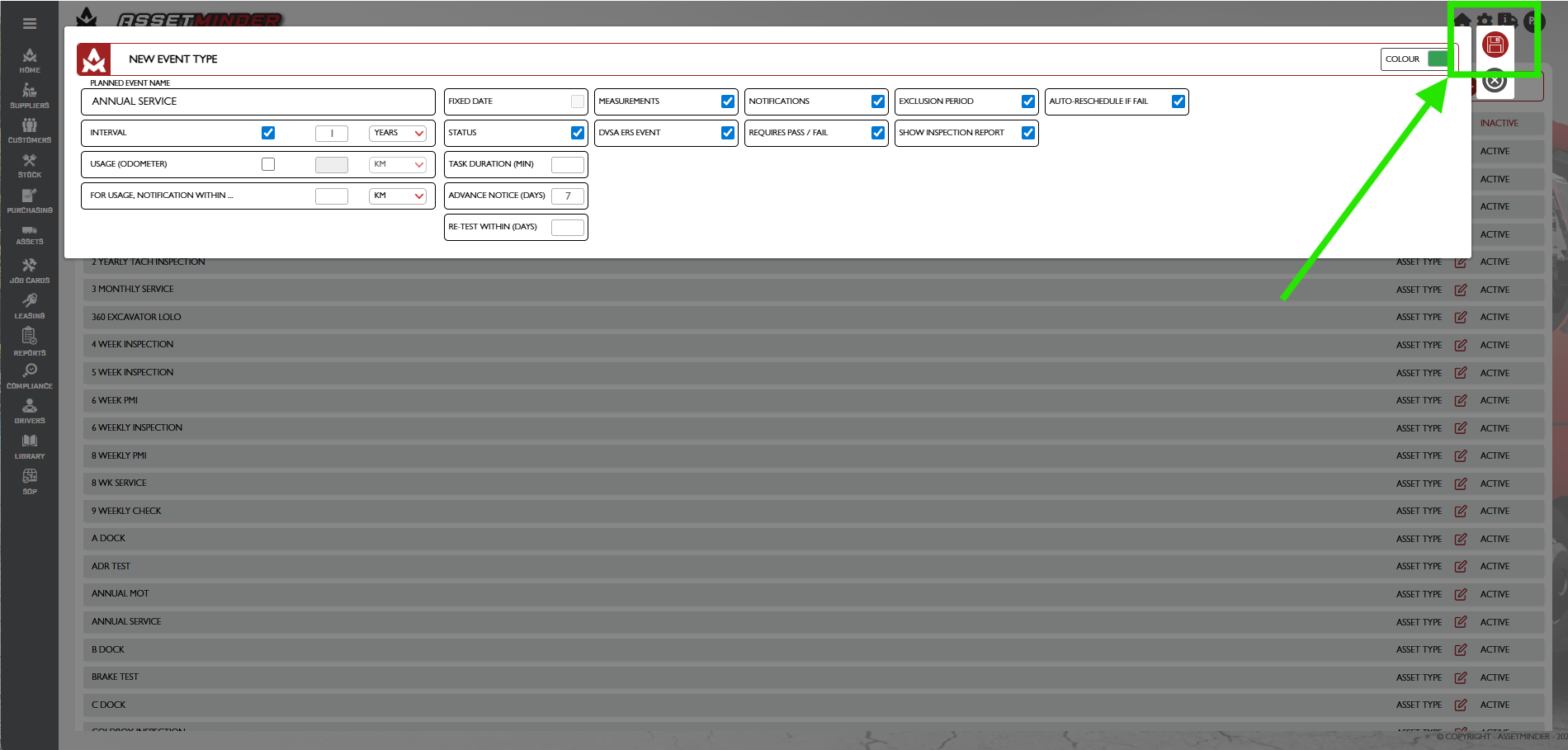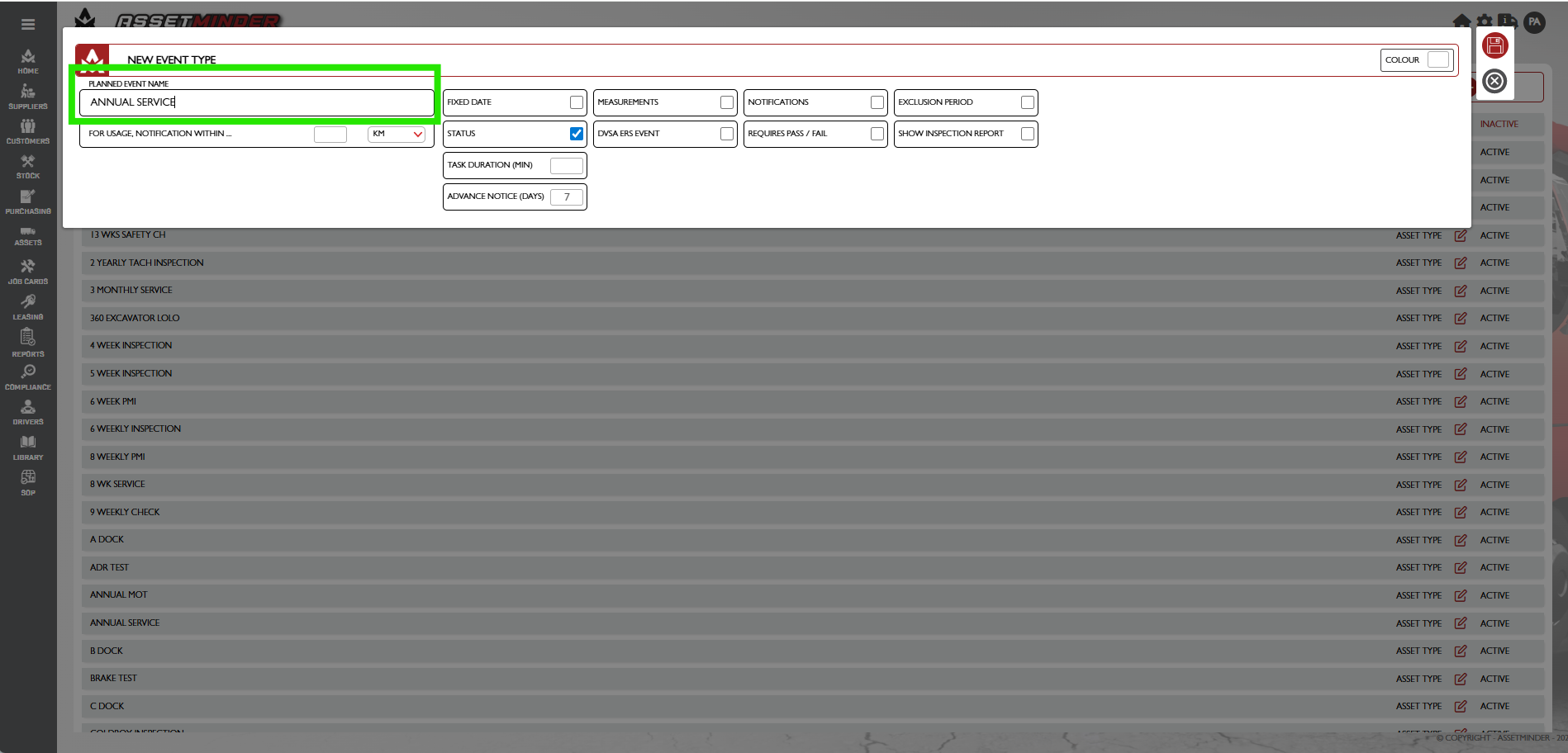 9. The planned event template now exists in the system and can be used on assets.
