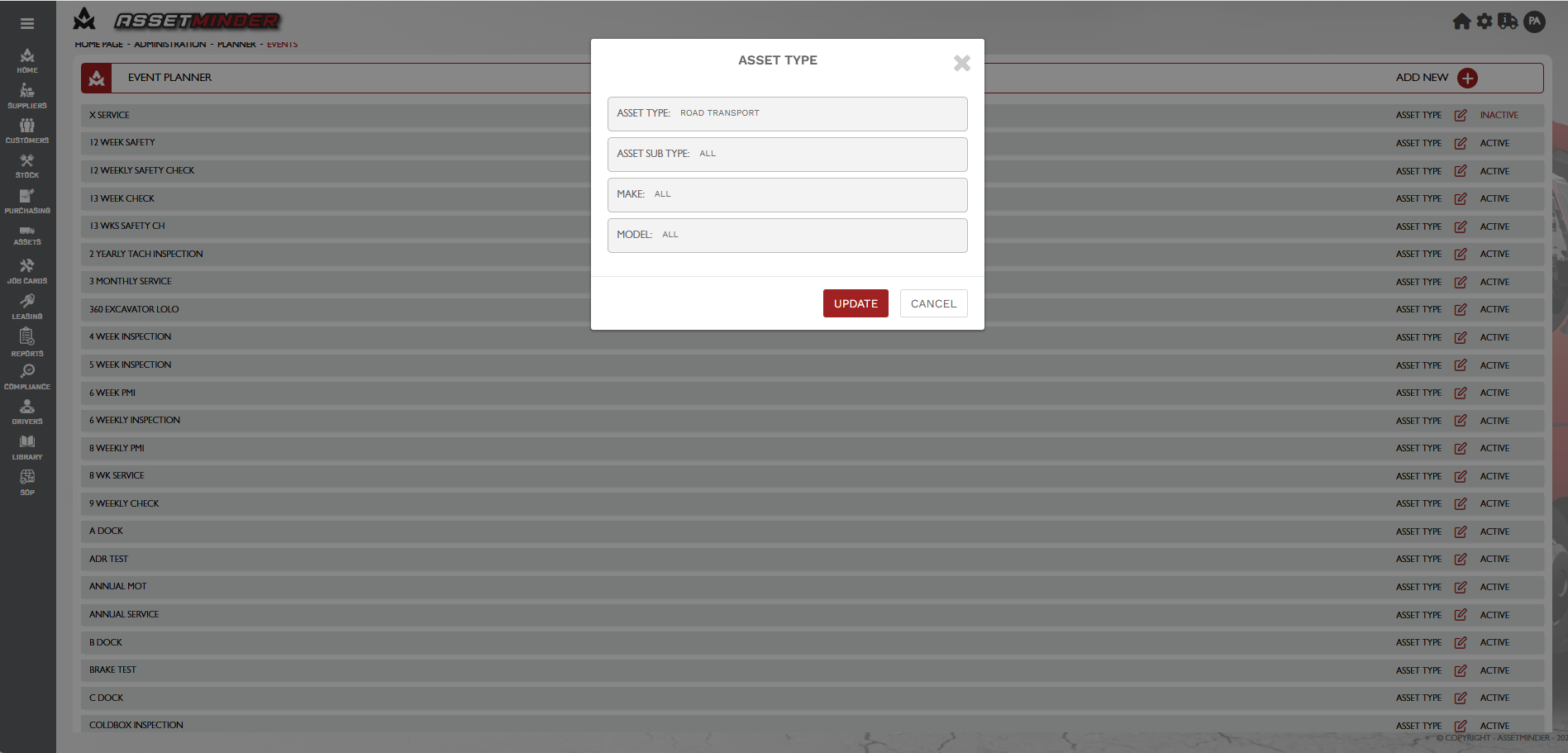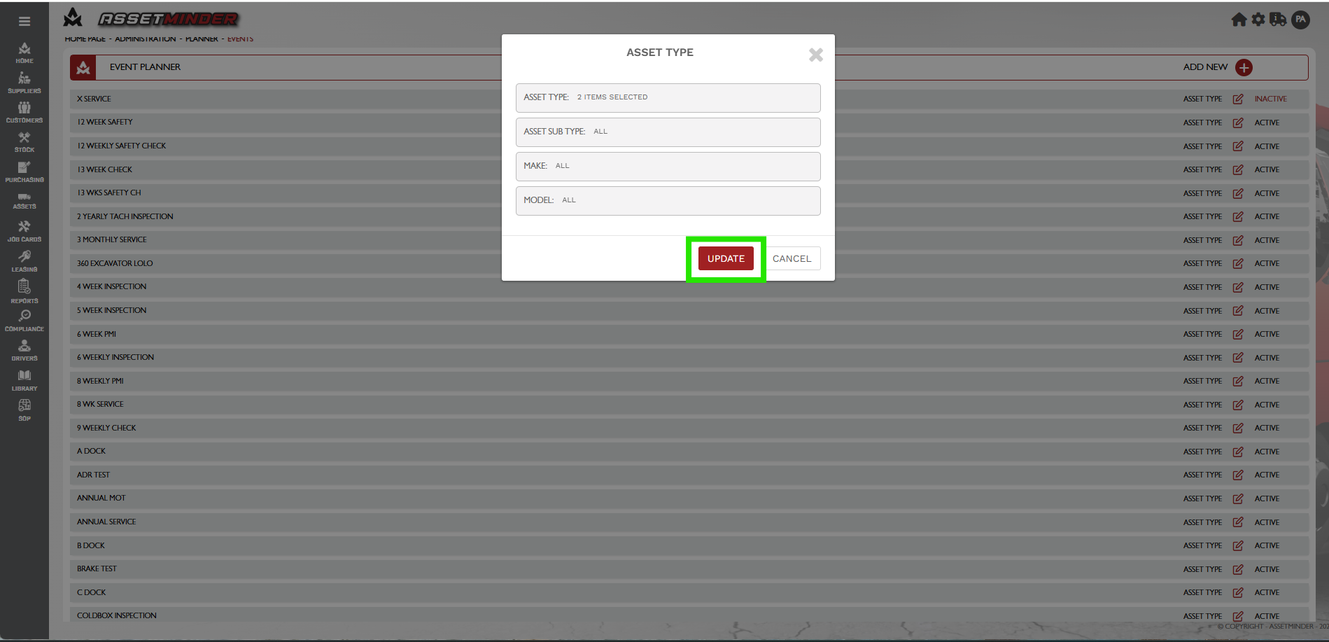 12. Click Update when done. Those asset types can now use this planned event template.