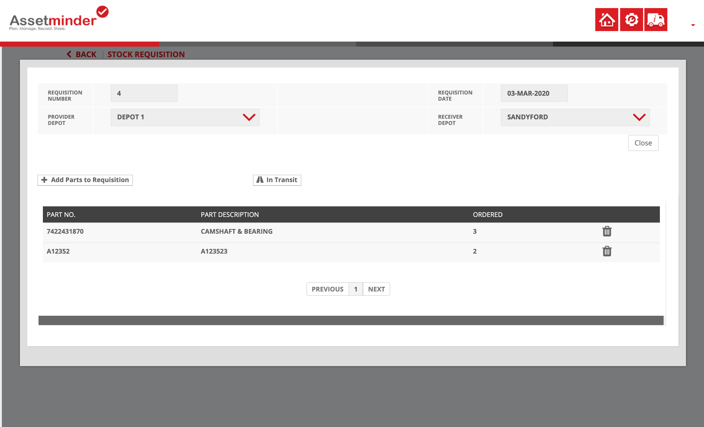 14. This example, three Camshaft & Bearing parts are moved from Depot 1 to Sandyford. The 3 parts transferred to Sandyford show up in Depot Totals